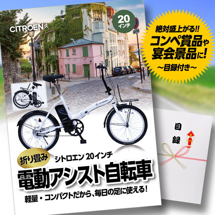 ■自転車のスペック 組立時サイズ:約W157×D55×H110cm、折り畳み時サイズ:約W85×D48×H71cm、サドル高さ:約79.5〜91.5cm、重量:約24kg バッテリー:リチウムイオンバッテリー(容量5.8Ah) 走行距離:約30km 材質:スチール(リム:アルミ合金)、生産国:中国 仕様:アシスト機能、折り畳み仕様、折り畳みハンドル、シングルギア パネル付の目録はゴルフコンペの景品・賞品、結婚式の二次会、忘年会、新年会、ビンゴ、イベント、宴会の景品で盛り上がります。