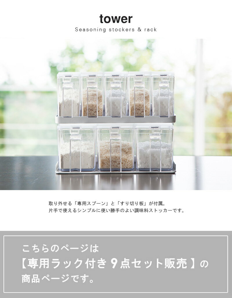 ・ストッカー[S/350ml]×5 ・ストッカー[L/650ml]×3 ・ラック[L]×1 -サイズ- ストッカー[S/350ml]:幅5.5cm×奥行15cm×高さ11cm ストッカー[L/650ml]:幅9cm×奥行15cm×高さ11cm ラック[L]:幅27.5cm×奥行11.5cm×高さ13.5cm -材質- ストッカー:容器、蓋、スプーン、すり切り板:PS樹脂 ラック:スチール(粉体塗装)、マット:合成ゴム -仕様- 色:ホワイト、ブラック ストッカー容量:[S]350ml、[L]650ml ストッカー耐熱温度:80℃ ストッカー耐冷温度:-40℃ ラック耐荷重:約3kg 付属品:分別シール×2 -配送- 玄関先お届け -お届けの目安- 3営業日後出荷/4-5日後お届け目安 ※土日祝日は定休日 -配達日時指定- 指定可 -追加送料が必要な地域- 沖縄県全域/離島(金額は事前にお問い合わせください)調味料ストッカー&ラック タワー tower 【9点セット】 調味料ストッカー タワー 単品/Sサイズ 単品/Lサイズ 3点セット 4点セット 6点セット 9点セット